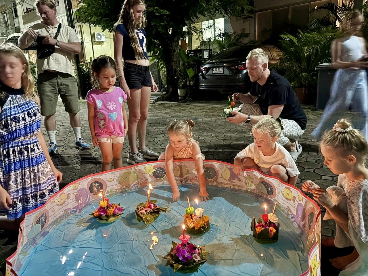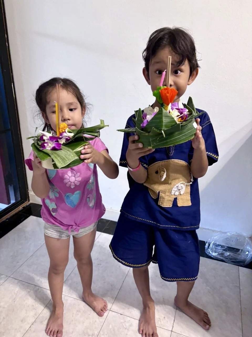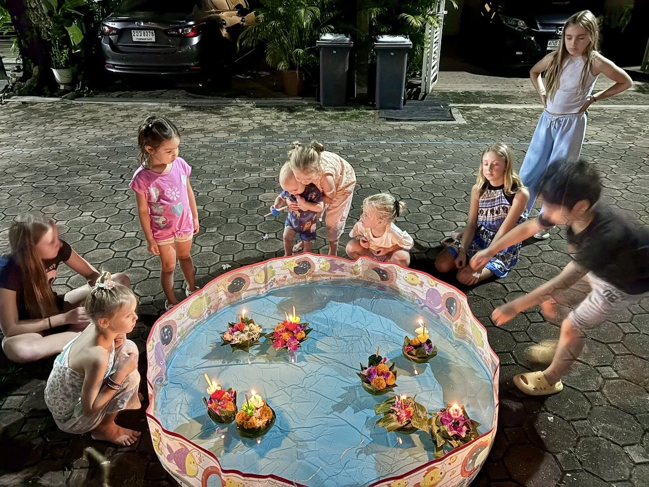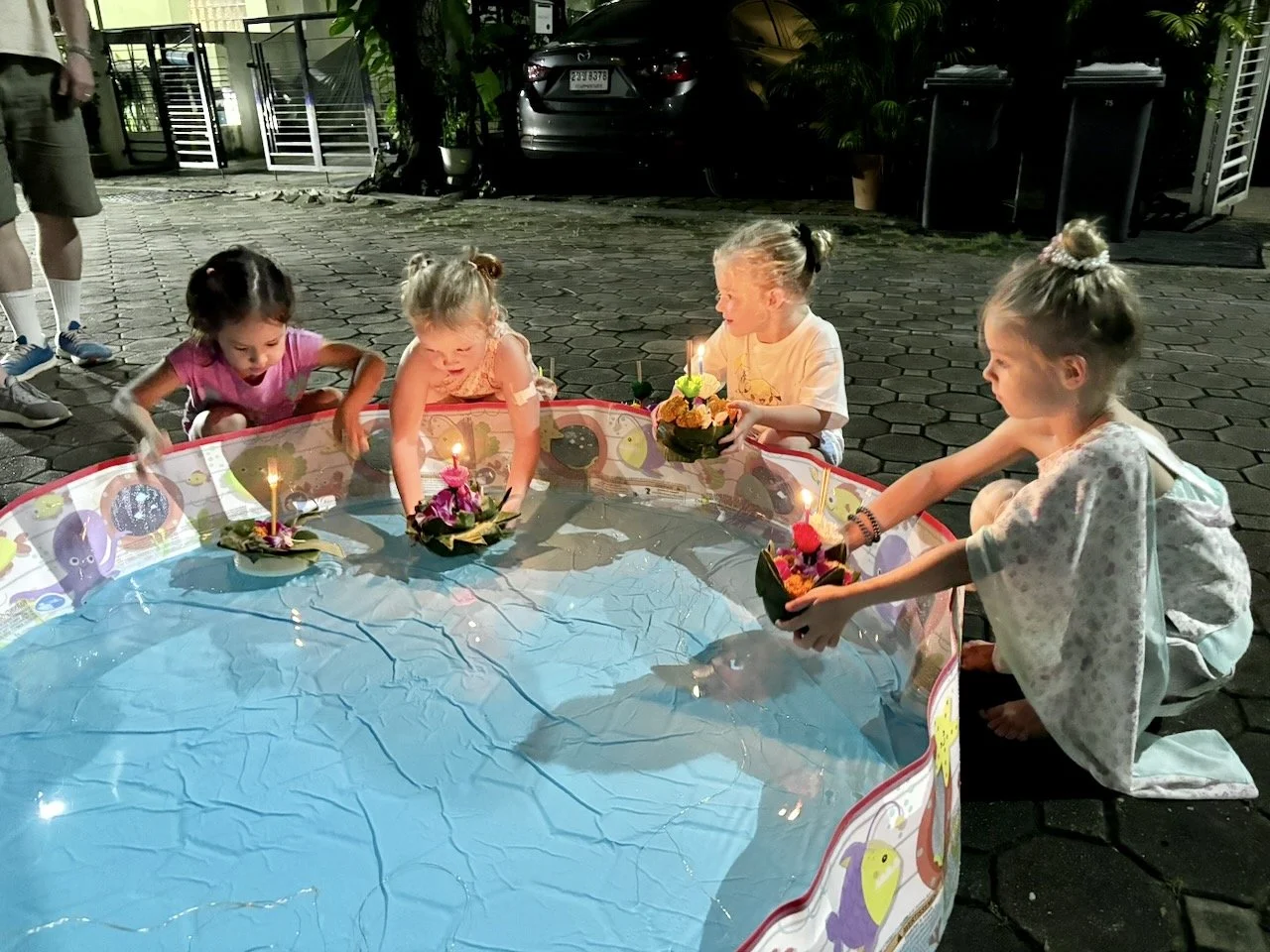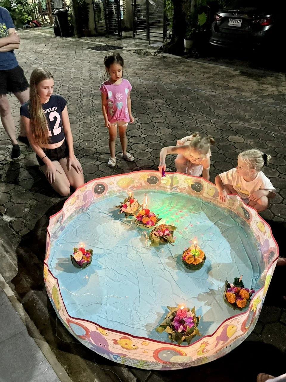 And on Wednesday (Tuesday at Annabel’s) we celebrated a low-key Loy Krathong. Both Arlo & Lucy made Krathongs at school, and Lucy floated hers with our neighbors in a small wading pool: a perfect scale for the festivities.