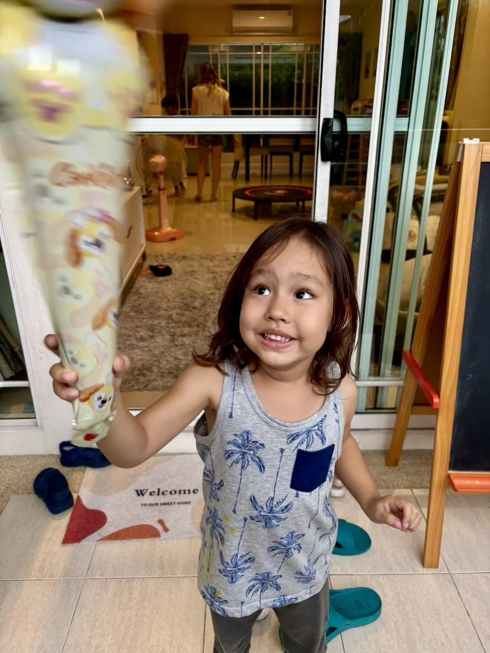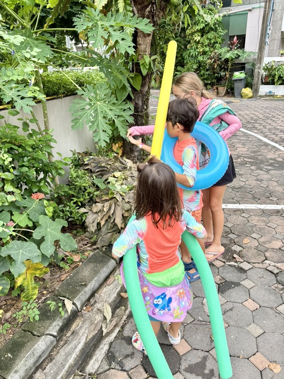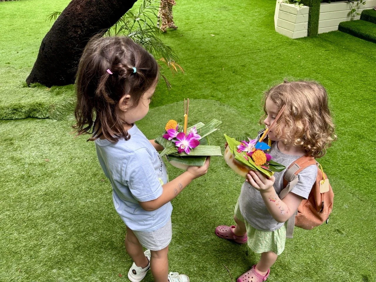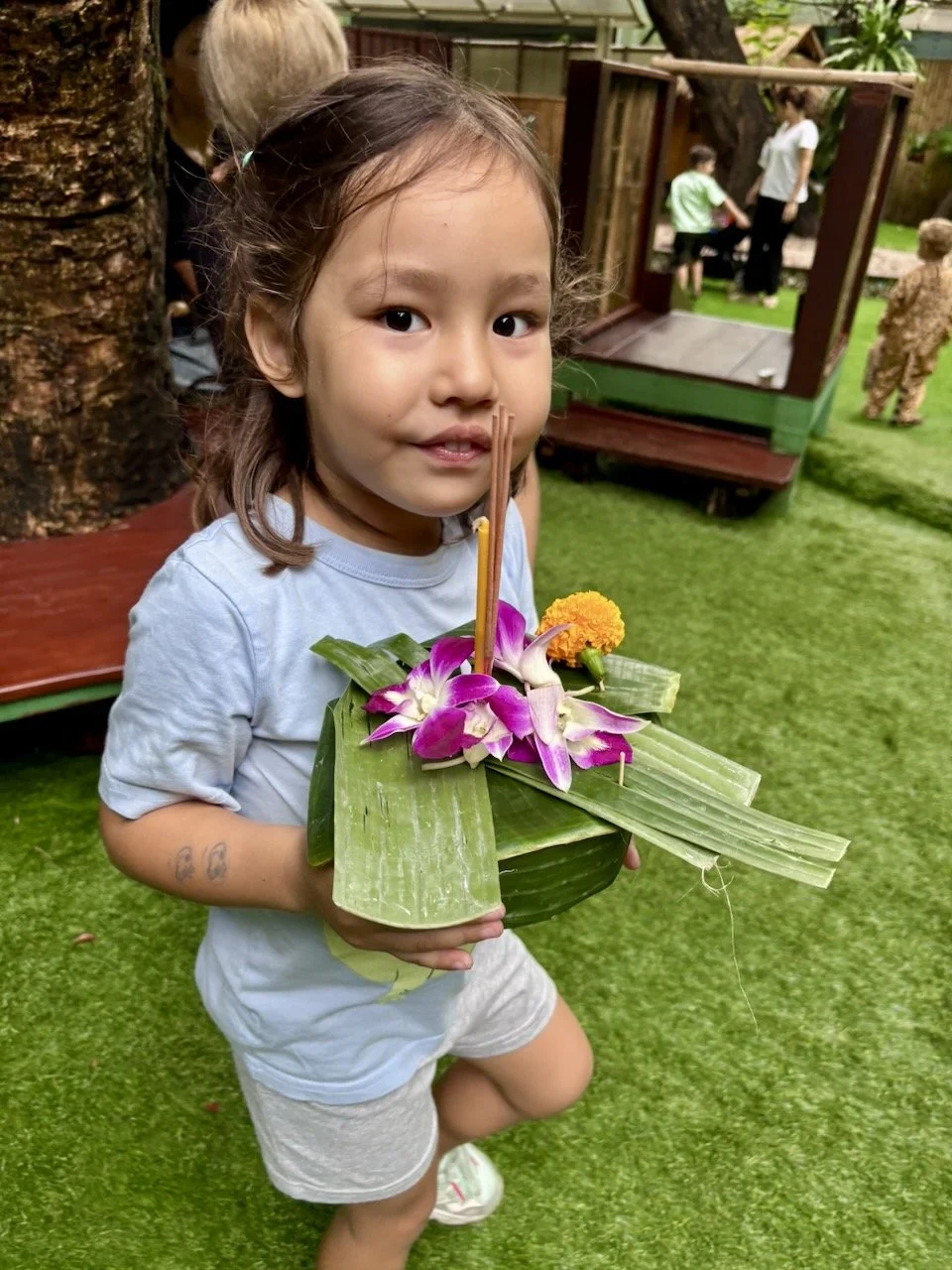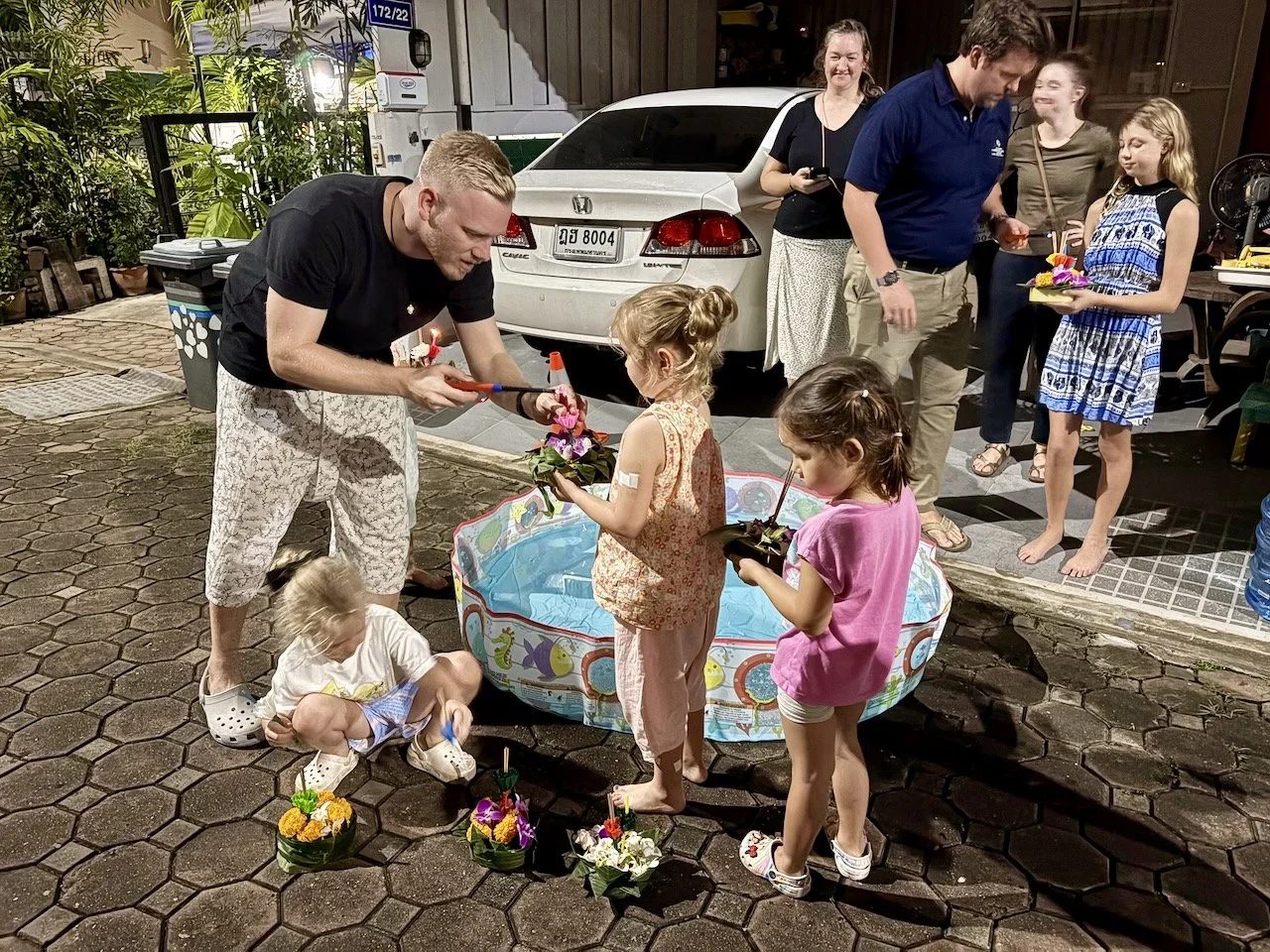 And on Wednesday (Tuesday at Annabel’s) we celebrated a low-key Loy Krathong. Both Arlo & Lucy made Krathongs at school, and Lucy floated hers with our neighbors in a small wading pool: a perfect scale for the festivities.