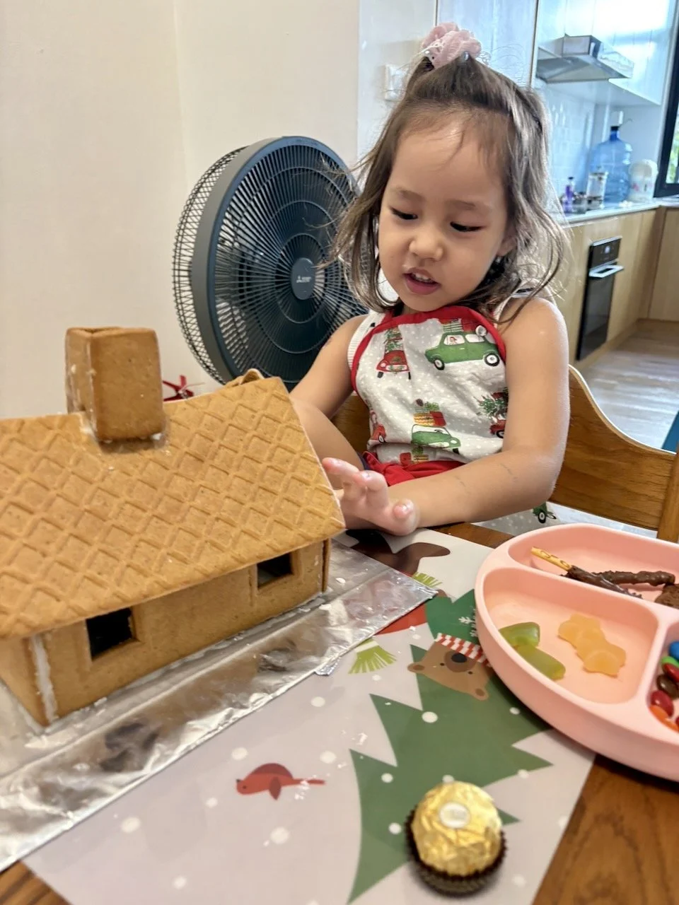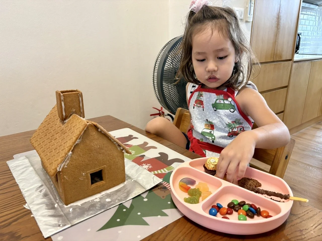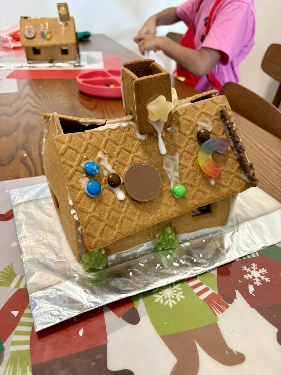 Long-overdue gingerbread house decorating. Learning: use hot glue!