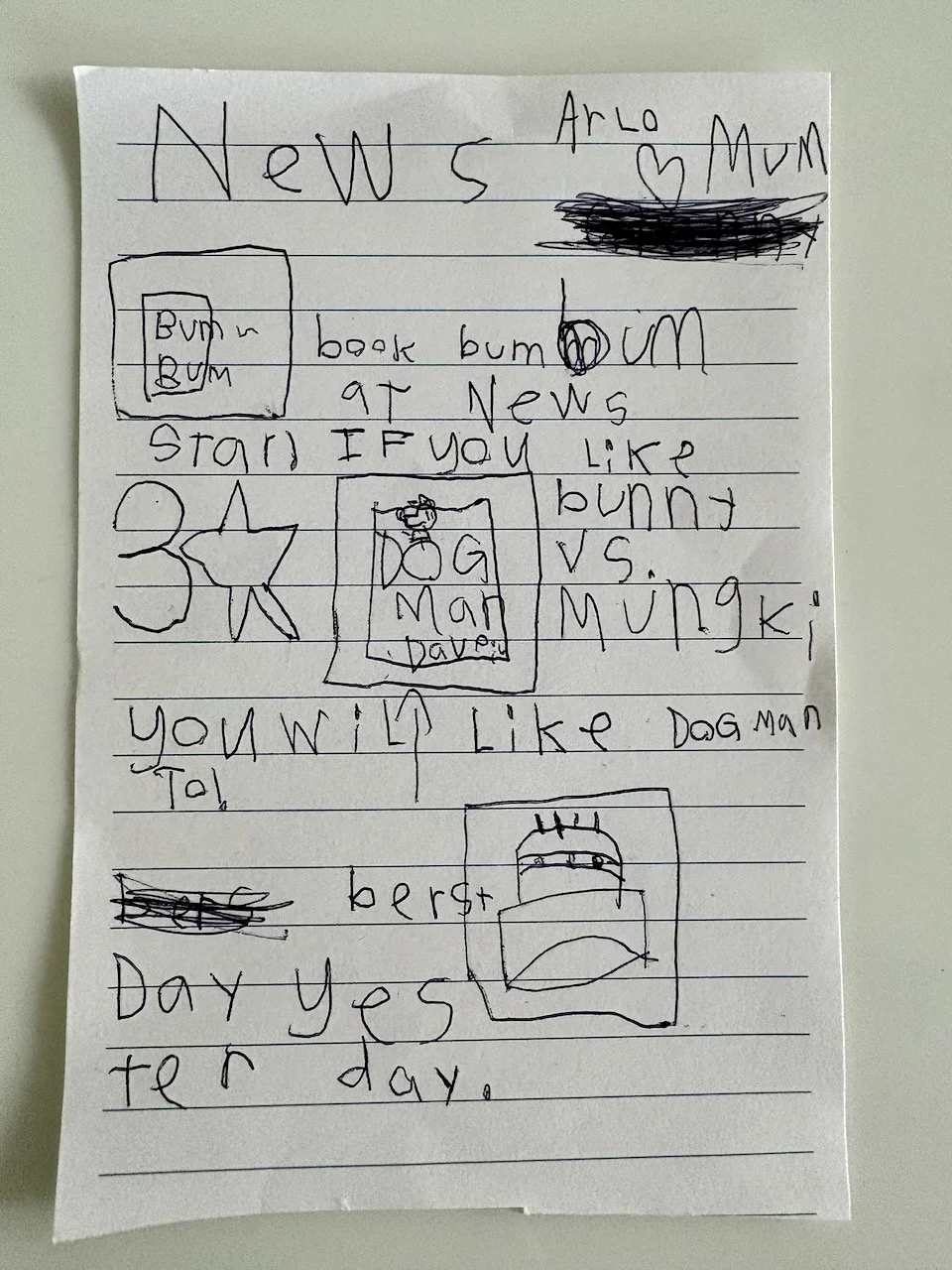 Arlo's latest creative outlet is writing newspapers.